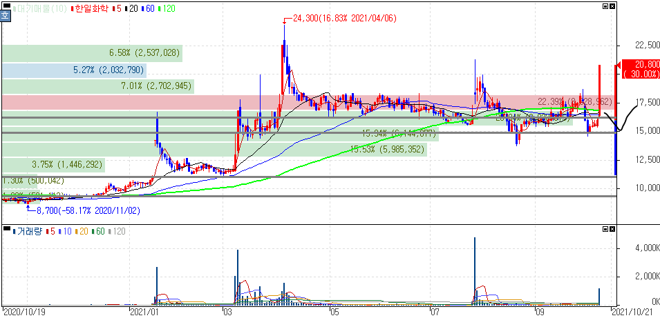 한일화학 경우 올해초 상승을 보인 이후 비교적 일정한 구간으로 횡보를 보였다는 점이 특징으로 볼 수 있는데요. 모멘텀이 유지되는 동안 물량이 언제 넘겨질지도 확인해야 볼 필요도 있습니다.