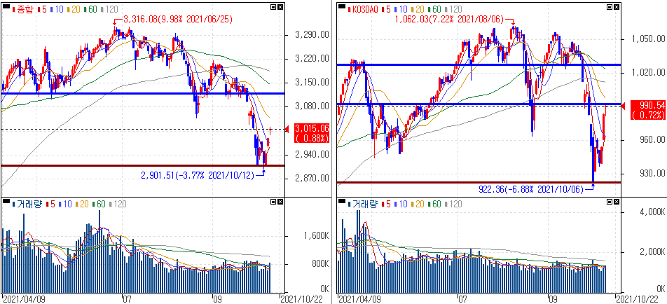 금일 코스피 지수는 +0.88% 상승한 3,015.06에 마감하였고, 코스닥 지수는 +0.72% 상승한 990.54에 마감하였습니다. TSMS 실적 호조 및 미국 필라델피아 반도체 지수 상승 등에 힘입어 상승하였습니다.