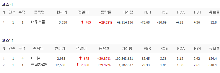 코스피에서는 대우부품이 상한가를 기록했고, 코스닥에서는 티비씨, 녹십자웰빙이 상한가를 기록했습니다.