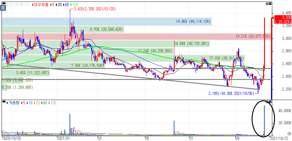 대우부품은 전반적인 추세가 하락으로 보여지는 흐름을 보여왔다는 것에 다소 미비한 관심을 받아왔었는데 이번 상한가를 통해 거래량도 확보되면서 추세 전환에서 달라지는 흐름들을 확인해 볼 수 있는 상황입니다.