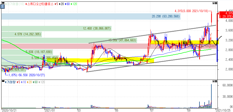 단순 스튜디오산타클로스 주가 차트에서는 지난해 급락을 보인 이후 재반등을 보여주는 추세전환까지 보여주면서 계단식 상승까지 보여주면서 시세를 확연히 보여주고 있습니다. 개인적으로도 1거래일만에 30%가 넘는 수익률을 볼 수 있을만큼 심심치 않게 결과를 볼 수 있었던 종목인만큼 재료를 잘 확인하신분들은 결과를 보셨을거라 봅니다.