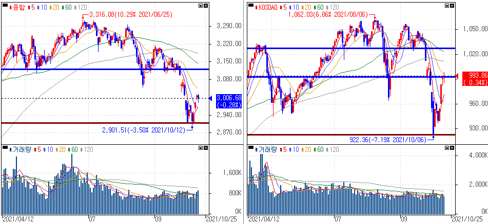 금일 코스피 지수는 -0.28% 하락한 3,006.68에 마감하였고, 코스닥 지수는 +0.34% 상승한 993.86에 마감하였습니다. 글로벌 인플레이션 우려가 지속되면서 코스피는 하락을 보였습니다.