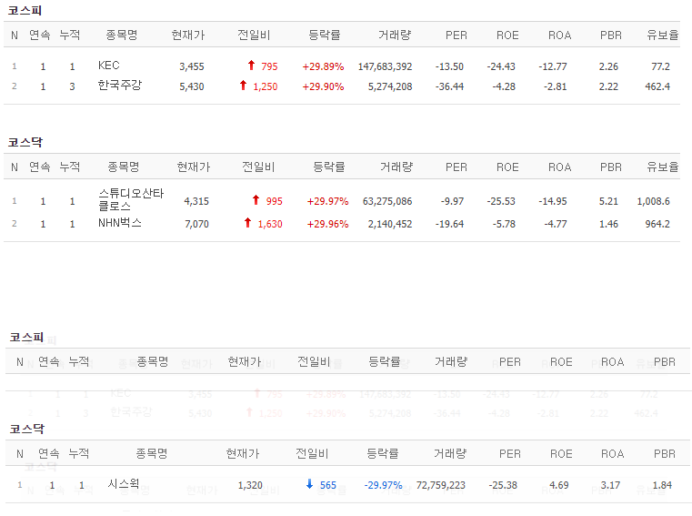 코스피에서는 KEC, 한국주강이 상한가를 기록했고, 코스닥에서는 스튜디오산타클로스, NHN벅스가 상한가를 기록했습니다. 반면 시스웍이 하한가를 기록했습니다.