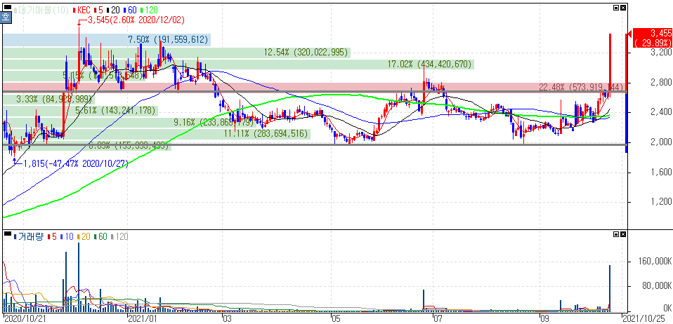 KEC는 지난해 하반기 고점을 기록한 이후 비교적 주가 흐름이 잔잔하게 이어오면서 금일 상한가를 보여주는 모습을 볼 수 있는데 전반적으로 KEC가 가지고 있는 모멘텀을 기준으로 최근 거래량과 함께 상승추세로 전환을 보여준 모습은 명확하게 찝어내실 수 있는 종목인만큼 공부를 하시는 분들은 다시 한번 복기를 하시면서 데이터를 쌓아두신다면 좋습니다.