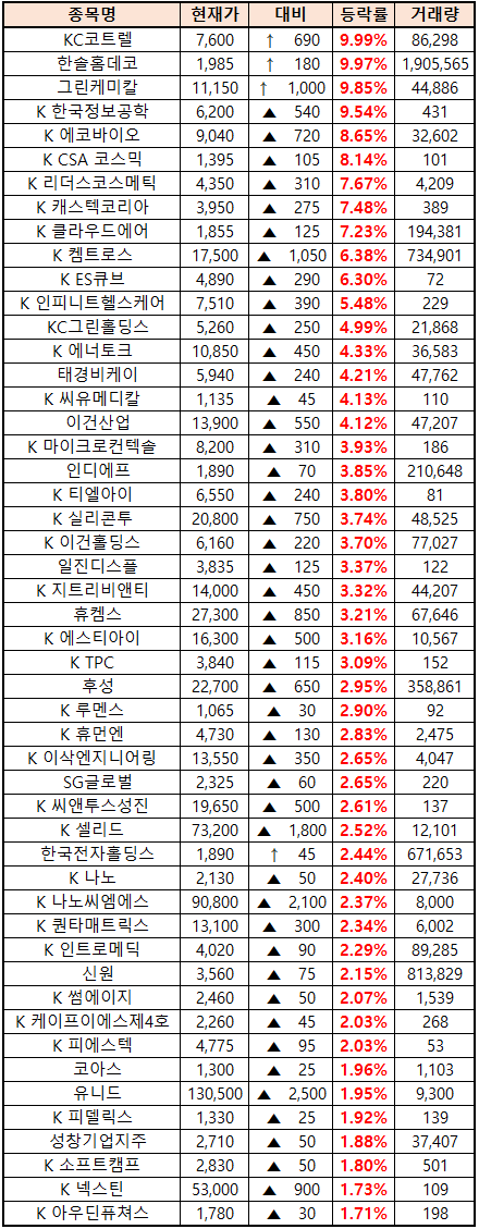 (종목명 앞에 'K'는 코스닥 종목을 의미합니다.)
