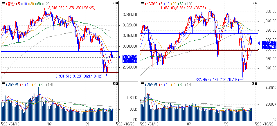 금일 코스피 지수는 -0.19% 하락한 3,007.33에 마감하였고, 코스닥 지수는 -0.79% 하락한 993.70에 마감하였습니다.