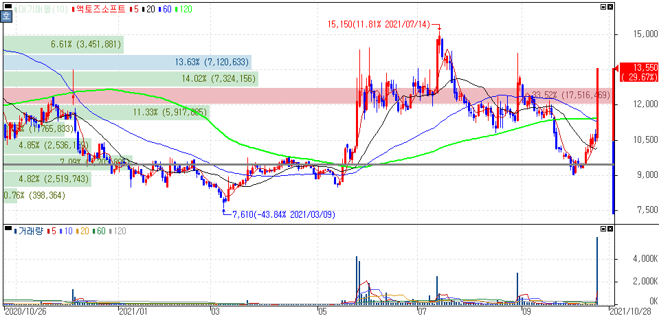 대표이사 구오 하이빈, 글로벌 가상화폐 거래소 '디코인거래소' 주요 투자자 부각에 상한가를 기록한 액토즈소프트 주가 입니다.
