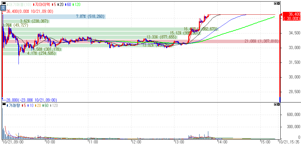 신규상장 첫날 상한가를 기록한 지아이텍 주가 입니다.