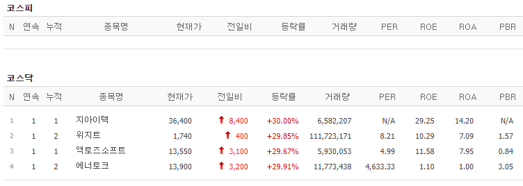 코스피에서는 상한가 종목이 없었고, 코스닥에서는 위지트, 액토즈소프트, 지아이텍이 상한가를 기록했습니다.