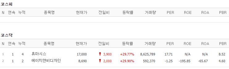 코스피에서는 상한가 종목이 없었고, 코스닥에서는 휴마시스, 에이치앤비디자인이 상한가를 기록했습니다.