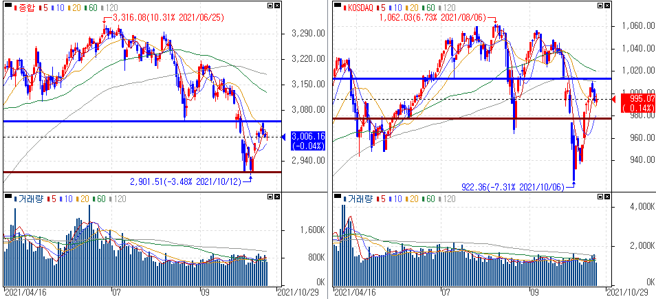 금일 코스피 지수는 -0.04% 하락한 3,006.16에 마감하였고, 코스닥 지수는 +0.14% 상승한 995.07에 마감하였습니다. 다음주 주요 기업 실적 발표를 앞두고 관망세를 보이며 마감하였습니다.