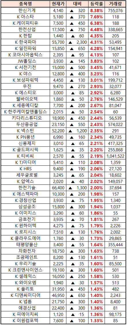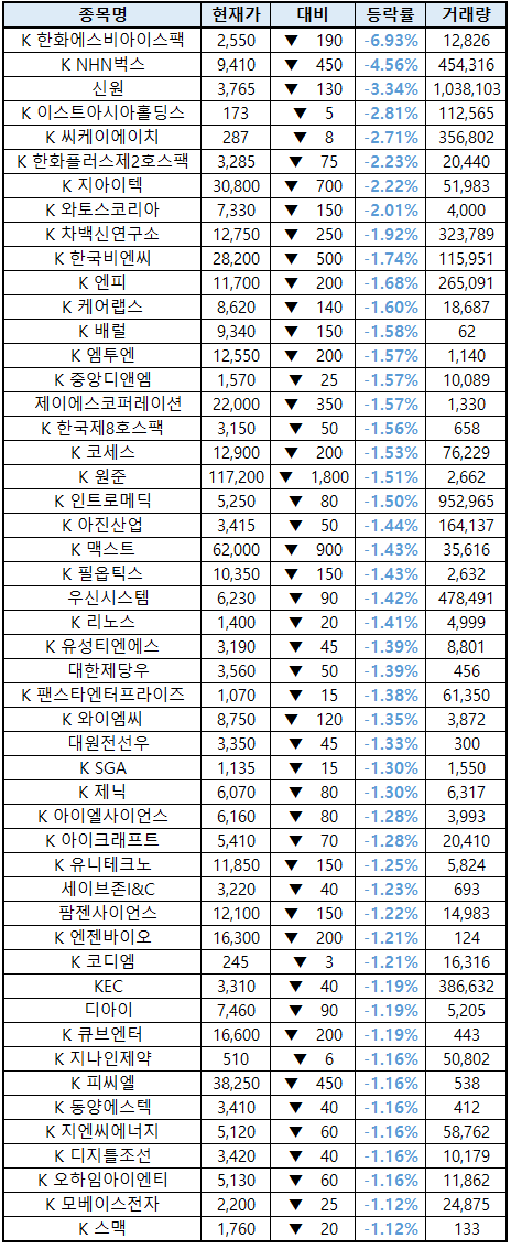 (종목명 앞에 'K'는 코스닥 종목을 의미합니다.)