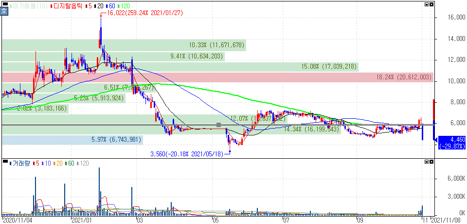 구체적인 사유는 앞으로 지켜봐야겠지만 최근 세종메디칼에서도 갑작스러운 하한가가 나왔었습니다. 디지탈옵틱은 스마트폰용 카메라렌즈 등의 사업을 영위하는 업체인데 얼마전 제3자배정 유상증자를 결정하고, 타액기반 코로나19 검체채취도구 및 신속진단키트 개발 소식이 나왔음에도 불구하고 하한가를 보여주었습니다.