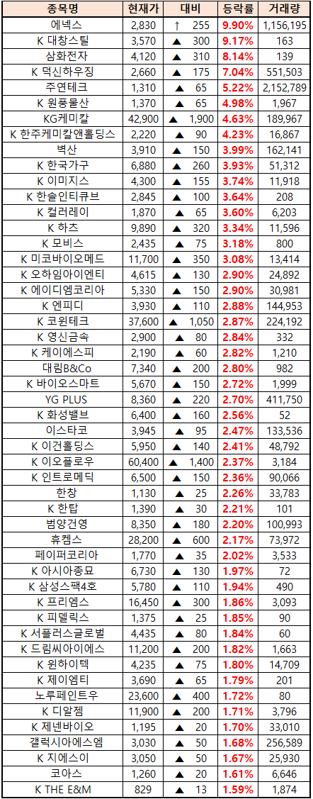 (종목명 앞에 'K'는 코스닥 종목을 의미합니다.)