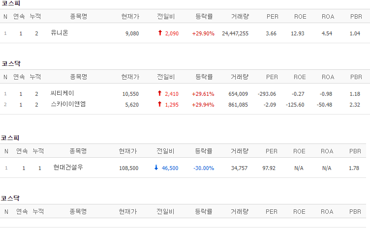 코스피에서는 유니온이 상한가를 기록했고, 코스닥에서는 씨티케이, 스카이이앤엠이 상한가를 기록했습니다. 반면 현대건설우가 하한가를 기록했습니다.