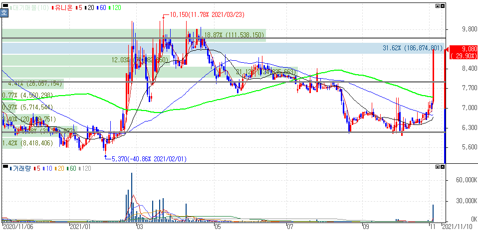 금일 상한가를 기록한 유니온 외에도 유니온머티리얼 +19.57%, 동국알앤에스+3.58% 등 희귀금속 테마가 상승세를 보였고, 유니온은 요소수 품귀 소식 속 요소수 5대 브랜드로 알려진 불스원 주식을 보유하고 있는 점이 부각됐고, 유니온의 자회사인 유니온머티리얼(+19.57%)도 동반 급등을 보였습니다.