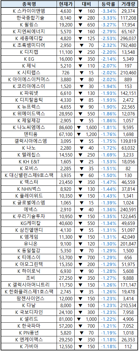 (종목명 앞에 'K'는 코스닥 종목을 의미합니다.)