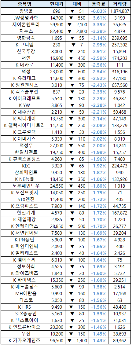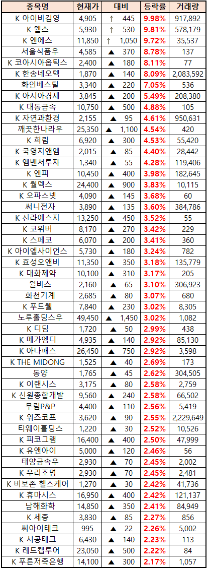 (종목명 앞에 'K'는 코스닥 종목을 의미합니다.)