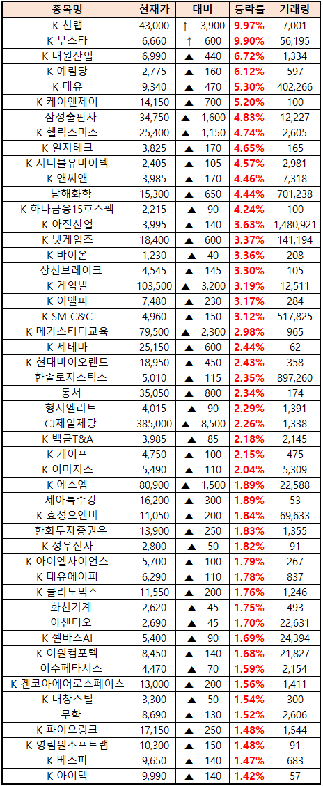 (종목명 앞에 'K'는 코스닥 종목을 의미합니다.)