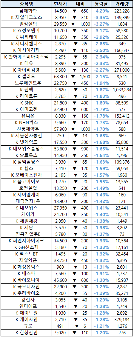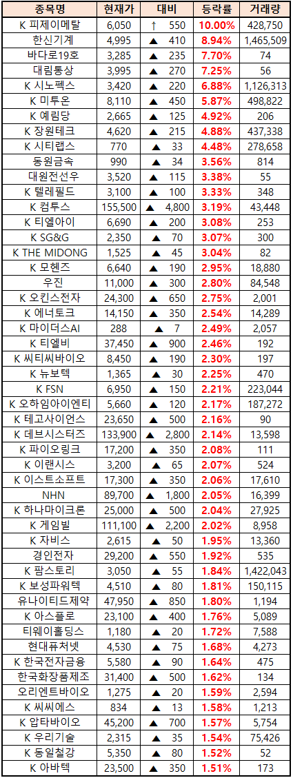 (종목명 앞에 'K'는 코스닥 종목을 의미합니다.)