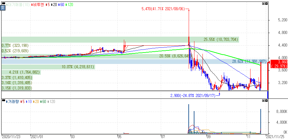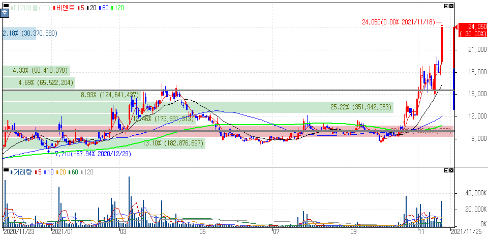 3분기 실적 호조 및 비트코인을 담보로 대출 받을 수 있는 서비스 출시 소식에 상한가를 기록한 비덴트 주가 입니다.