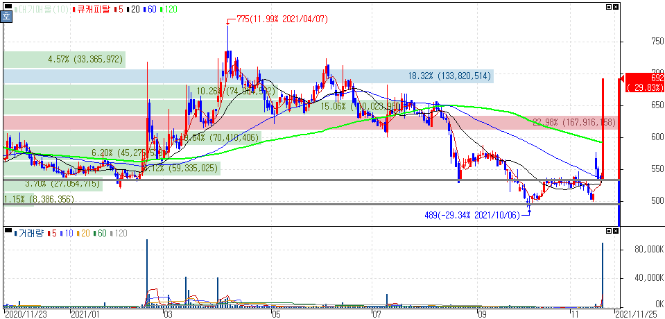 워낙 길게 역배열로 하락을 보이다 상한가를 기록한 종목입니다. 전환의 계기가 될 수도 있으나 전반적인 기업의 배경을 확인해두는 것이 필요합니다.