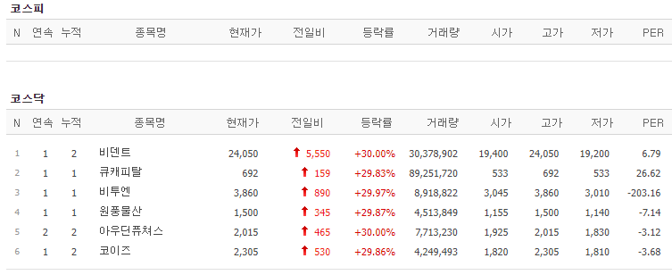 코스피에서는 상한가 종목이 없었고, 코스닥에서는 비덴트, 비투엔, 원풍물산, 아우딘퓨쳐스, 코이즈가 상한가를 기록했습니다.