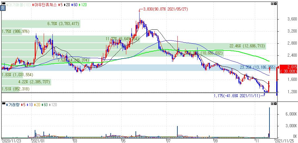 어제에 이어 연속 상한가를 기록한 아우딘퓨쳐스 입니다. 아우딘퓨쳐스도 역배열 하락세를 보인 종목인데 이틀연속 상한가를 기록하면서 단기적인 전환국면을 보여주고 있습니다.