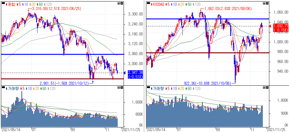금일 코스피 지수는 -0.51% 하락한 2,947.38에 마감하였고, 코스닥 지수는 +0.15% 상승한 1,032.77에 마감하였습니다. 인플레이션에 대한 우려 속 혼조세를 보였습니다.