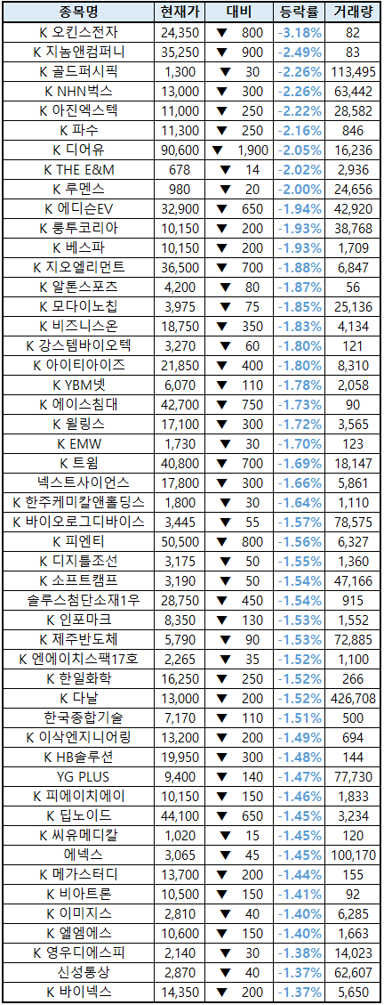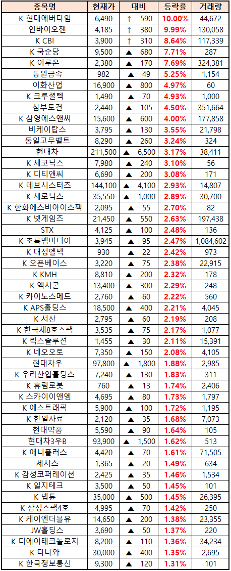 (종목명 앞에 'K'는 코스닥 종목을 의미합니다.)