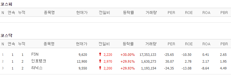 코스피에서는 상한가 종목이 없었고, 코스닥에서는 FSN, 인포뱅크, 라닉스가 상한가를 기록했습니다.