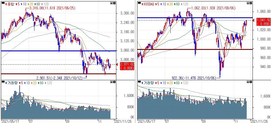 어제 증시 분위기상 단기적인 상승을 유추해 볼 수 있었습니다만 깔끔하게 상승을 보인 금요일이였습니다. 하지만 코스피 흐름에서는 아직 오락가락한 모습이 보이면서 어느방향으로 갈지 신중하게 볼 필요가 있습니다. 반면 코스닥 경우 저항구간이 오차범위내 인접하면서 돌파냐 저항이냐 두 갈림길로 나뉠 수 밖에 없습니다.