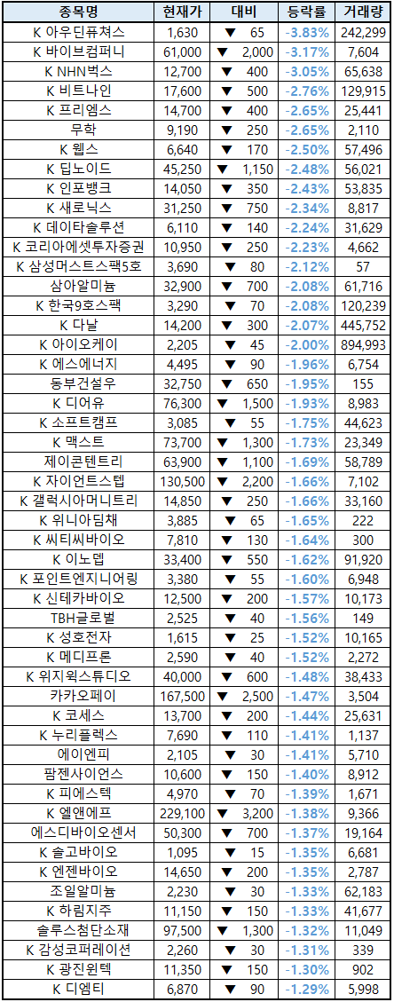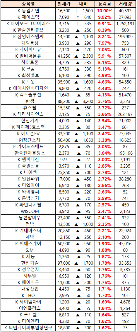 (종목명 앞에 'K'는 코스닥 종목을 의미합니다.)