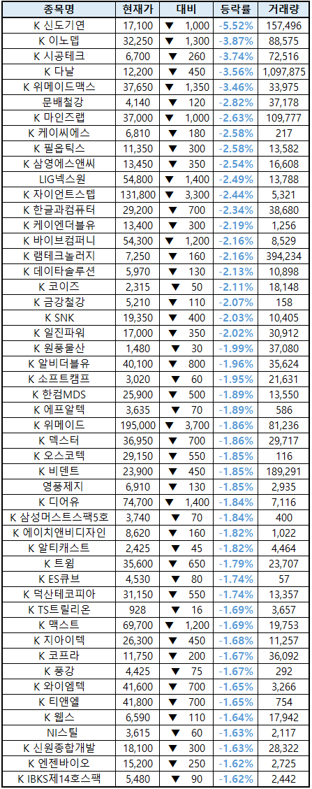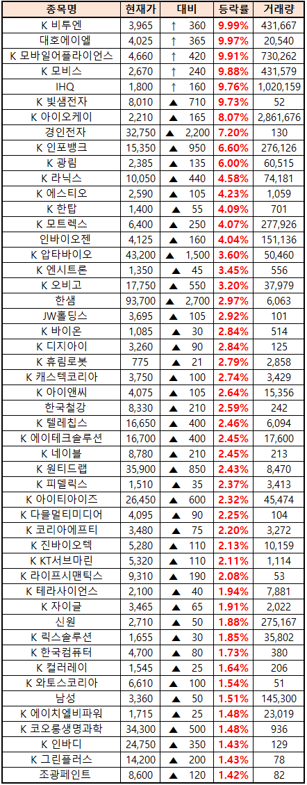 (종목명 앞에 'K'는 코스닥 종목을 의미합니다.)