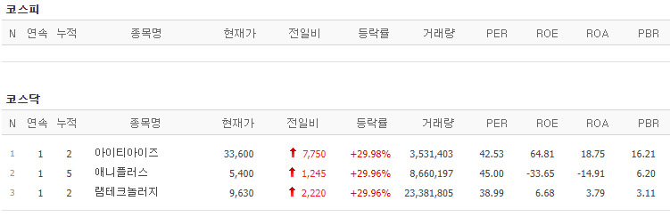 코스피에서는 상한가 종목이 없었고, 코스닥에서는 아이티아이즈, 애니플러스, 램테크놀러지가 상한가를 기록했습니다.