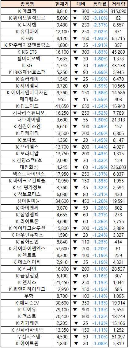 (종목명 앞에 'K'는 코스닥 종목을 의미합니다.)