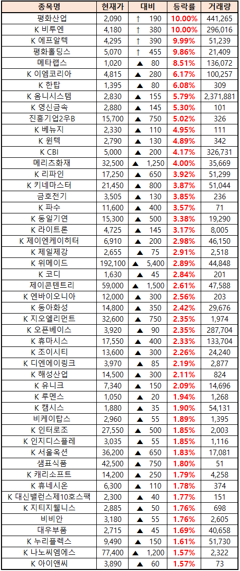 시간외 단일가매매 종가 종목 확인시 단순 급등주 등락률만 볼 것이 아니라, '거래량'에 따르는 거래대금도 판단하면서 보는 것이 중요합니다.