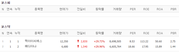 코스피에서는 상한가 종목이 없었고, 코스닥에서는 멕아이씨에스, 메디아나가 상한가를 기록했습니다.