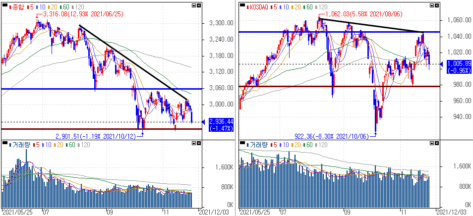 금일 코스피 지수는 -1.47% 하락한 2,936.44에 마감하였고, 코스닥 지수는 0.96% 하락한 1,005.89에 마감하였습니다. 코로나19 '누 변이' 바이러스 확산세 우려 속 하락을 보였습니다.