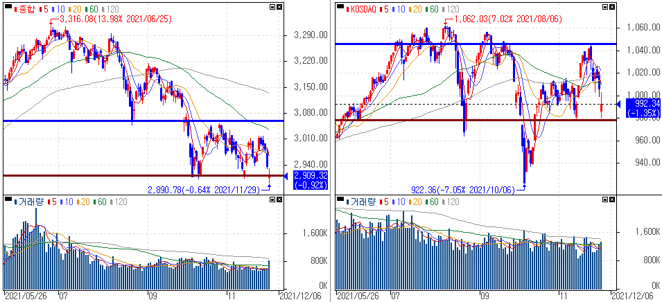 금일 코스피 지수는 -0.92% 하락한 2,909.32에 마감하였고, 코스닥 지수는 -1.35% 하락한 992.34에 마감하였습니다. 오미크론 공포에 증시에 충격을 받았습니다.