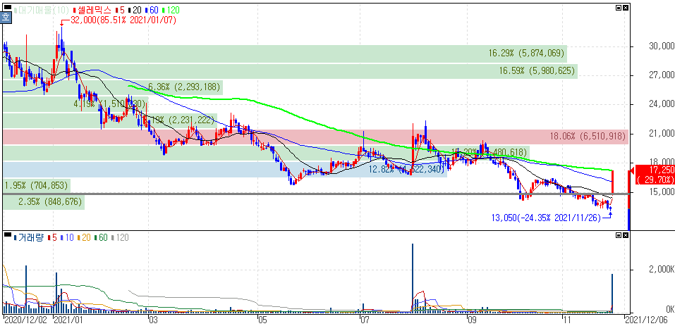 코로나19 변이 '오미크론' 확산 우려 속 오미크론 분석 가능 기술 보유 부각에 상한가를 기록한 셀레믹스 주가 입니다.