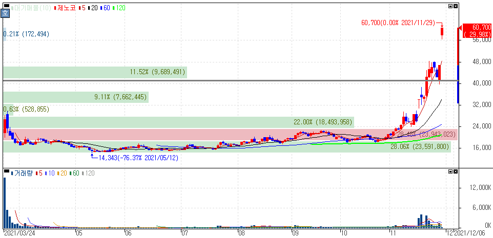 기준가격은 46,700원임의 무상증자 권리락 효과 발생한 제노코 입니다. 무상증자로 인해 가격대 등의 지표들이 변경된다는 점은 참고 하시길 바랍니다.