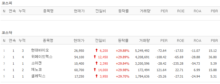 코스피에서는 상한가 종목이 없었고, 코스닥에서는 현대바이오, 위메이드맥스, 소마젠, 제노코, 셀레믹스가 상한가를 기록했습니다.