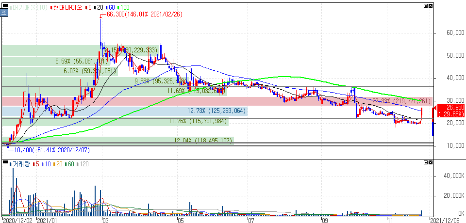 오미크론에 효과 코로나 치료제 성과 공개 소식에 상한가를 기록한 현대바이오 주가 입니다.