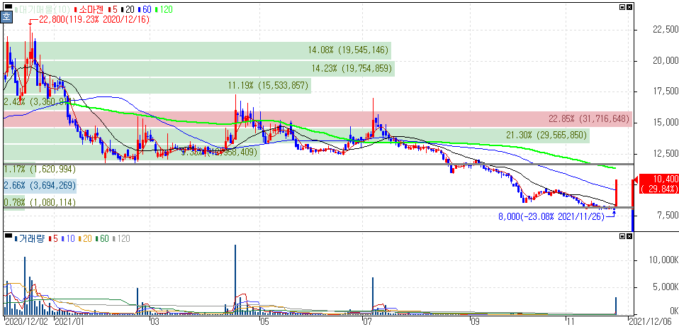 코로나19 변이 '오미크론' 확산 우려 등에 상한가를 기록한 소마젠 주가 입니다.
