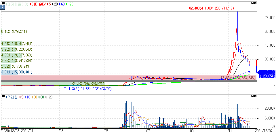 에디슨EV 주가 :: 2021년 11월 30일 오늘의 하한가 종목