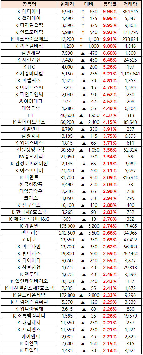 (종목명 앞에 'K'는 코스닥 종목을 의미합니다.)