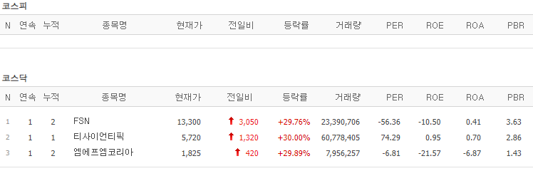 코스피에서는 상한가 종목이 없었고, 코스닥에서는 FSN, 티사이언티픽, 엠에프엠코리아가 상한가를 기록했습니다.