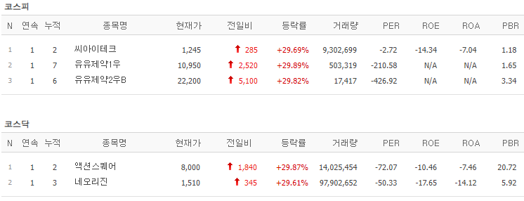 코스피에서는 씨아이테크, 유유제약1우, 유유제약2우B가 상한가를 기록했고, 코스닥에서는 액션스퀘어, 네오리진이 상한가를 기록했습니다.