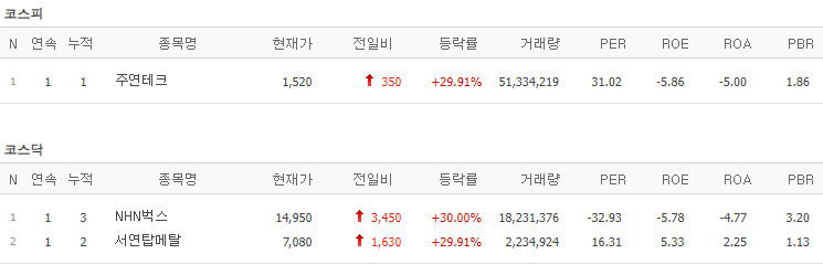 코스피에서는 주연테크가 상한가를 기록했고, 코스닥에서는 NHN벅스, 서연탑메탈이 상한가를 기록했습니다.